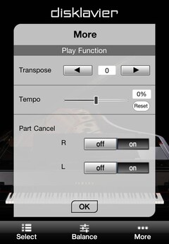 Bộ điều khiển Disklavier cho phép bạn sử dụng smartphone để thiết lập hoặc thay đổi các cài đặt theo cảm nhận nghe, chẳng hạn như chuyển giọng một giai điệu, thay đổi nhịp điệu, hoặc thay đổi độ cân bằng. Bộ điều khiển Disklavier cho phép bạn thiết lập hoặc thay đổi các chức năng sau. -Cân bằng âm lượng với nguồn phát âm thanh -Chuyển giọng - Nhịp điệu phát bài hát - Bỏ phần (bật, tắt phần bên phải hoặc bên trái)