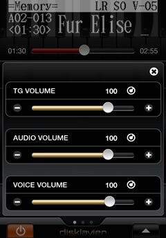 Bạn có thể xem các thông tin hiển thị từ Disklavier trên màn hình của thiết bị iOS, nên ngay cả khi bạn ở cách xa piano, bạn cũng có thể thay đổi các cài đặt cũng nhe kiểm tra thông tin bài hát khi Dislavier đang thực hiện phát lại tự động.