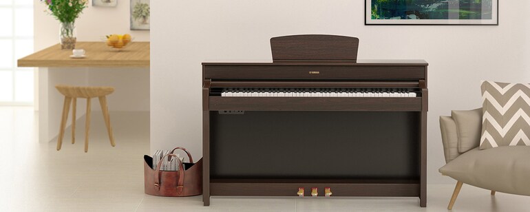 Đàn piano kỹ thuật số có bàn phím GH3 và tiếng mẫu từ đàn đại dương cầm hòa nhạc Yamaha CFX với bộ loa mạnh mẽ và màn hình điều khiển.