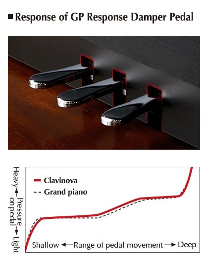 Các mẫu đàn cao cấp có Bàn đạp giảm âm phản hồi GP, mang đến đường cong lực cản của cây đại dương cầm, cảm giác ban đầu nhẹ khi chạm vào và ngày càng nặng hơn khi nhấn bàn đạp sâu hơn. Điều này cho phép người chơi làm quen với các sắc thái của bàn đạp một cách tinh tế.
