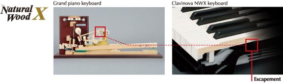 The NWX keyboard also features an escapement mechanism that reproduces the feel of an acoustic piano as it goes through the let-off and drop of the hammer when a key is played very softly. The action has been designed in such a way that the escapement is discernible only on the lightest keystrokes, similar to the keyboard of a grand piano.
