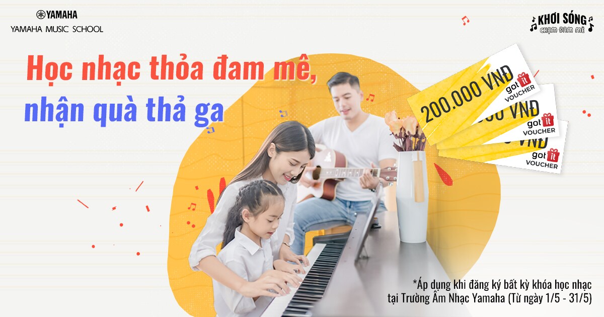 Khi đăng ký khóa học nhạc tại Trường Âm Nhạc Yamaha từ ngày 1/5 đến hết ngày 31/5 sẽ nhận ngay Voucher Gotit trị giá 200.000 VNĐ.