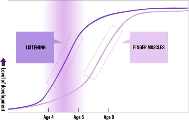 Giai đoạn từ 4-6 tuổi là giai đoạn thính giác phát triển vượt bậc và trẻ hiểu về thế giới xung quanh chủ yếu bằng đôi tai. Trong thời kỳ này, trẻ em có khả năng tiếp thu và phân biệt âm thanh rất nhanh chóng và hiệu quả. Khoa học gọi đây là giai đoạn vàng để phát triển các kỹ năng âm nhạc và ngôn ngữ. Đặc biệt, việc tiếp xúc với âm nhạc trong giai đoạn này có thể tạo ra cho trẻ những ảnh hưởng tích cực lâu dài.
