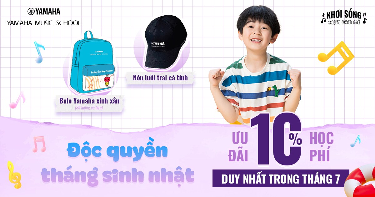 Trường Âm nhạc Yamaha đã sẵn sàng trao cho bé một mùa hè bùng nổ với COMBO HỌC BỔNG, bao gồm: LỚP HỌC THỬ MIỄN PHÍ + ƯU ĐÃI 10% HỌC PHÍ + QUÀ TẶNG ĐỘC QUYỀN chỉ áp dụng từ 01/07 - 31/07/2024: