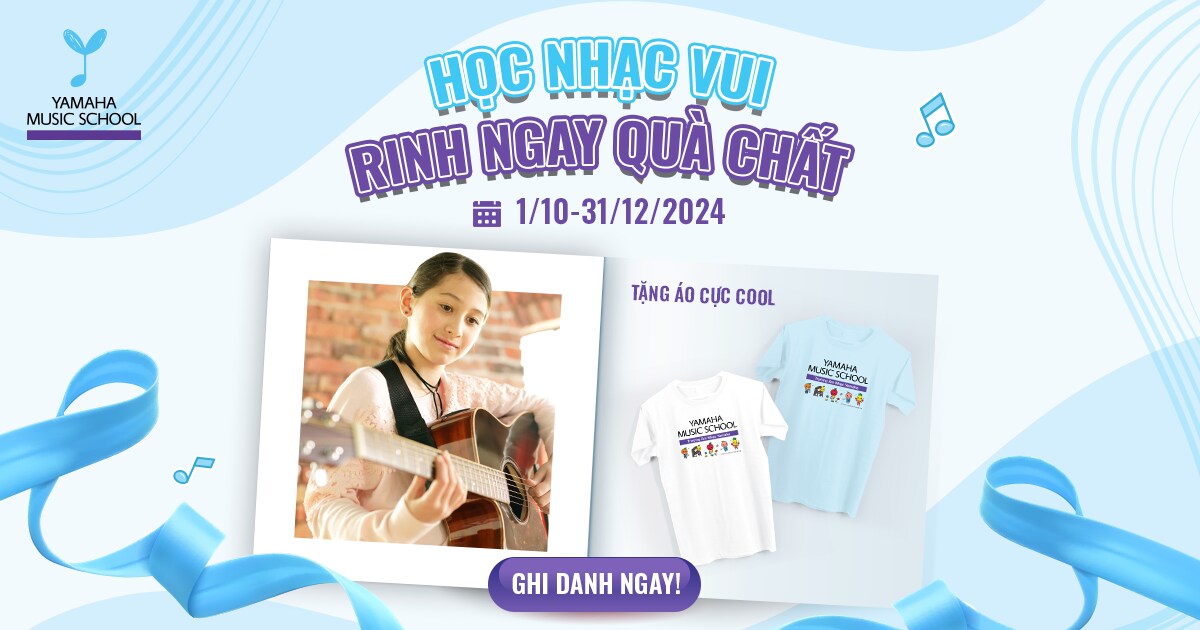 Từ ngày 1/10 đến 31/12/2024, hãy cùng Trường âm nhạc Yamaha thổi bùng đam mê âm nhạc khi đăng ký khóa học nhạc bất kỳ, các bạn nhỏ sẽ nhận ngay một chiếc áo thun Yamaha siêu cool, tha hồ diện đi học, đi chơi!