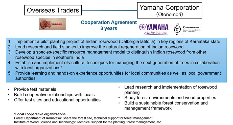 Thông qua hợp tác này, Yamaha và Overseas Traders sẽ cùng xây dựng chuỗi cung ứng bền vững cho gỗ hồng sắc Ấn Độ, bao gồm toàn bộ quy trình từ rừng trồng đến sản phẩm hoàn thiện, đồng thời hợp tác nghiên cứu và phát triển liên quan đến công tác bảo tồn loài cây này.