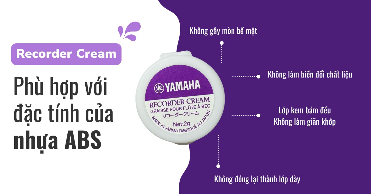 Phần lớn các dòng sáo recorder hiện nay được làm từ nhựa ABS. Dù chất liệu này bền bỉ, bề mặt khớp nối vẫn cần sự hỗ trợ phù hợp để duy trì độ trơn và bám tự nhiên. Với những ưu điểm nổi bật sau, Recorder Cream có thể giúp bảo dưỡng tối sáo Recorder: