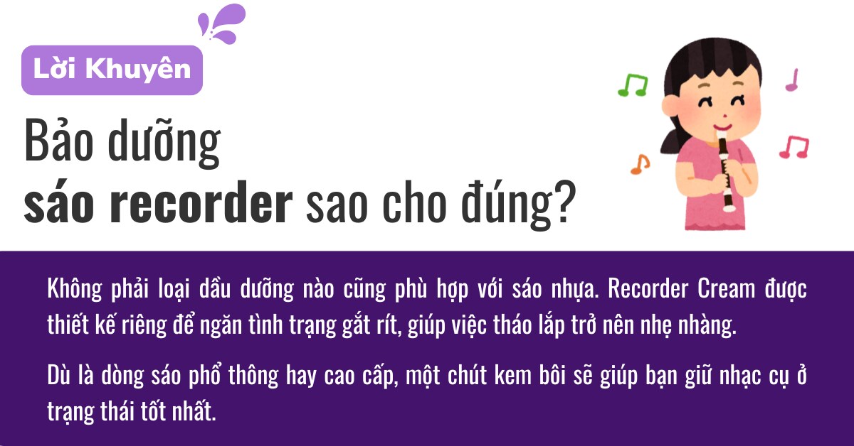 Việc chăm sóc recorder không quá phức tạp. Chỉ cần vài bước nhỏ mỗi ngày, người chơi đã có thể duy trì cảm giác mượt mà khi tập và giữ nhạc cụ luôn hoạt động một cách tự nhiên. Bạn có thể tham khảo kem bôi recorder cream của yamaha tại cửa hàng chính hãng của Yamaha Music Vietnam hoặc liên hiện trực tiếp đến fanpage Yamaha Music Vietnam để được tư vấn những sản phẩm phù hợp nhé!