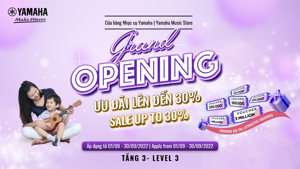 Hưởng ứng ngày khai trương sắp diễn ra của cửa hàng nhạc cụ Yamaha tại Takashimaya ngày 16/09 tới đây. Yamaha đem đến cho quý khách hàng ưu đãi đặc biệt duy nhất trong tháng 9 lên tới 30% với voucher giảm giá lên tới 3 triệu đồng