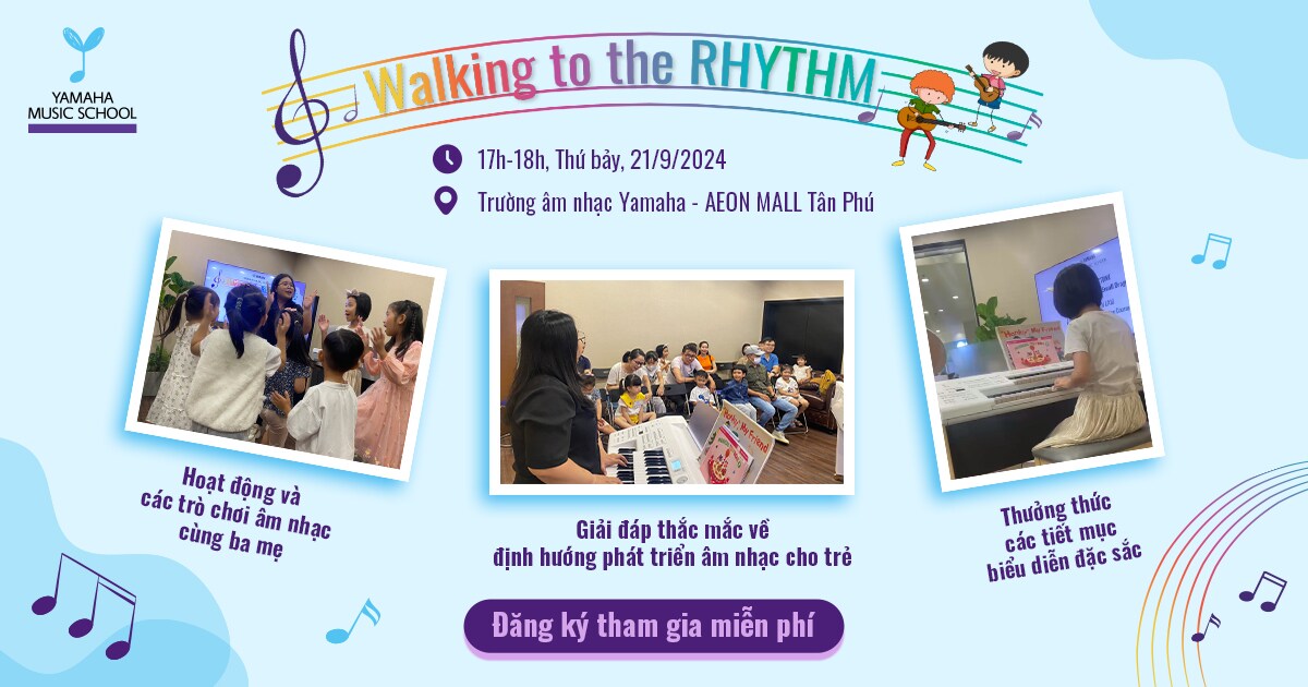 Thứ Bảy ngày 21/9 tới đây, hãy cùng bé yêu hòa mình vào thế giới âm nhạc đầy sắc màu tại sự kiện "Walking to the rhythm" tại Trường âm nhạc Yamaha - AEON MALL Tân Phú! Sự kiện đặc biệt dành riêng cho các bé từ 3,5 đến 5 tuổi, hứa hẹn sẽ đánh thức mọi giác quan và khơi dậy niềm đam mê nghệ thuật tiềm ẩn trong con.