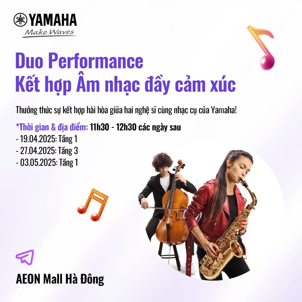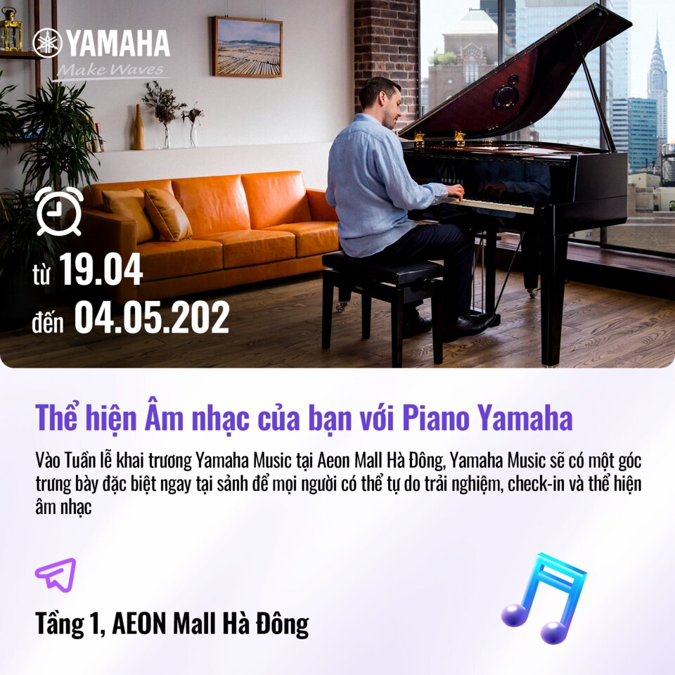 Đừng bỏ lỡ cơ hội trải nghiệm âm nhạc theo cách của riêng bạn tại Yamaha Music Playground. Dù bạn là người yêu âm nhạc, người đang học nhạc cụ hay đơn giản chỉ muốn có một kỳ nghỉ lễ thật vui vẻ cùng gia đình, Yamaha Music Playground tại Aeon Mall Hà Đông sẽ là điểm đến lý tưởng để tận hưởng âm nhạc, kết nối cảm xúc và tạo nên những kỷ niệm khó quên!