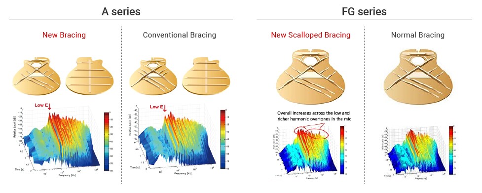 Trong khi phát triển các dòng đàn guitar mới L, FG, A Series và CSF, Yamaha sử dụng kết hợp các phép đo giữa mô phỏng và thực tế, cùng với nhiều thử nghiệm nghe âm thanh, nhằm xác định âm thanh, và từ đó là cách chế tạo cho mỗi cây đàn.