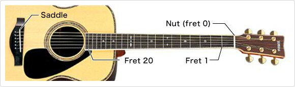 As strings become shorter their pitch increases. Guitars are designed to use this property so that the pitch they produce increases a semitone each time the position the string is held down at changes. The metallic parts on the neck are called frets. A player uses his or her left hand to hold the strings down in the spaces between the frets. There are a total of 20 frets for 20 semitones. This means that, for instance, string 6 can play from low E to C on the second octave (weak). However, the strings can be difficult to press nearer the sound hole, so this area is not often used.